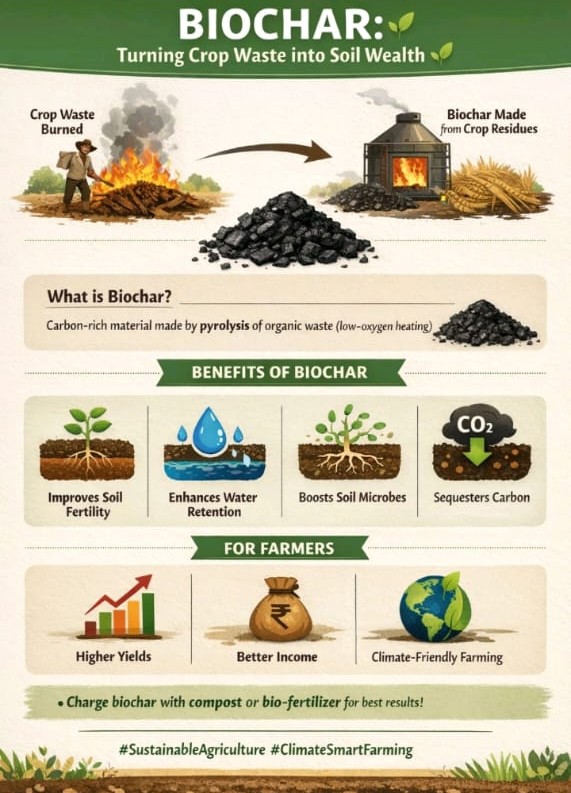 Biochar is a stable, carbon-rich material created when crop residues such as straw, husks, or wood waste are heated in a low-oxygen environment. Unlike open burning, this process prevents complete combustion, allowing carbon to remain locked in the material. When added to soil, biochar acts as a long-lasting soil amendment and helps improve soil quality over time.