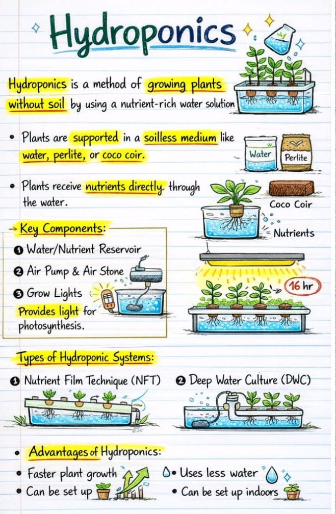 A method of growing plants without soil using nutrient-rich water.