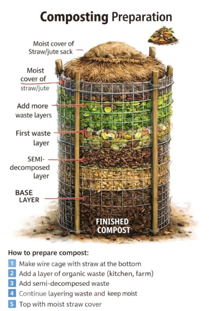 Compost is prepared by first creating a wire cage or pit with straw at the bottom, then adding layers of organic waste and semi-decomposed material. These layers are repeated while maintaining moisture, and finally covered with moist straw to support proper decomposition.