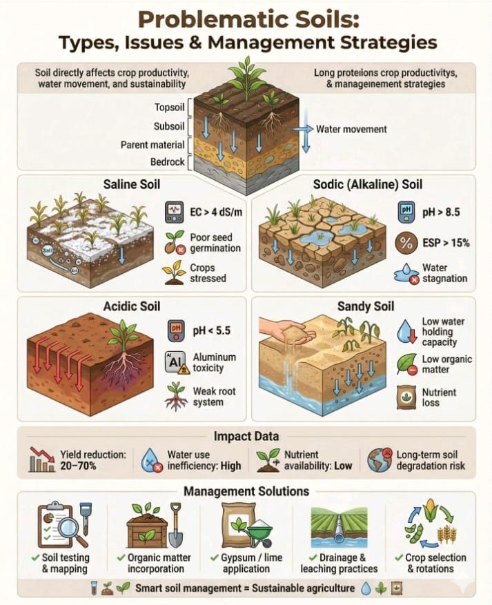 Such soils lead to poor seed germination, weak root development, water stagnation or rapid drainage, low nutrient availability, and reduced crop productivity. Long-term use without management can result in soil degradation and yield losses of 20–70%.