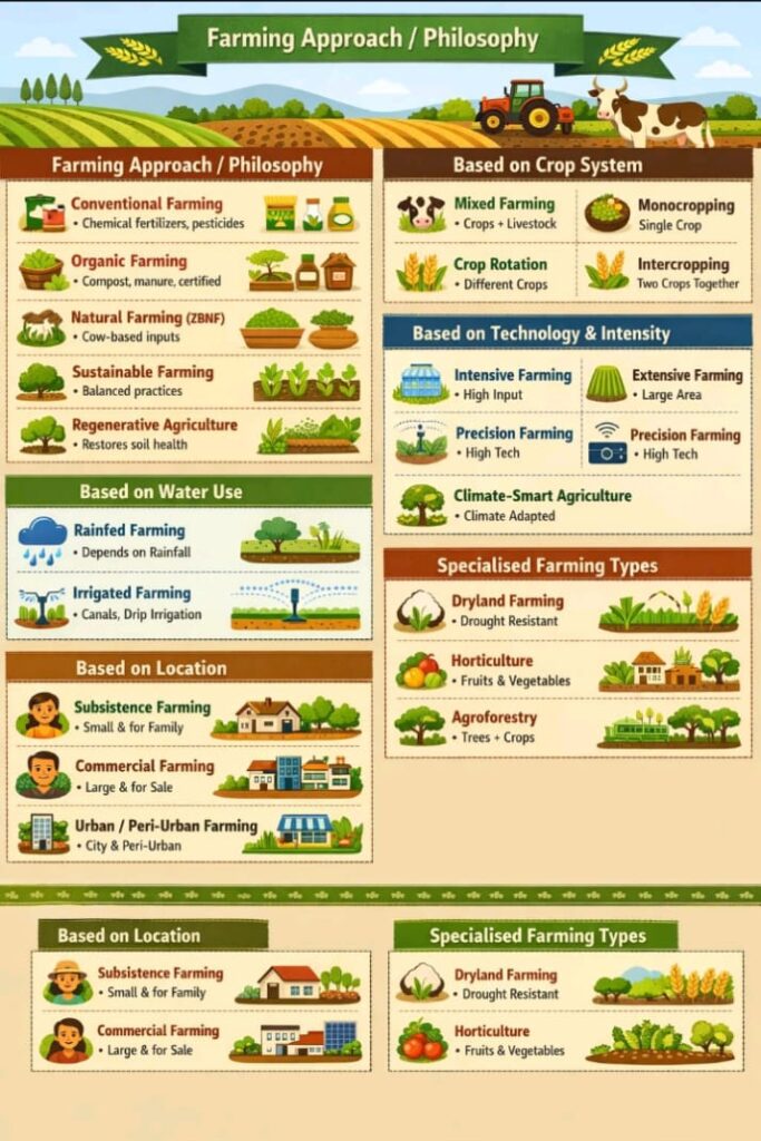 - Based on Crop System: Classifies farming according to how crops and livestock are grown and managed.