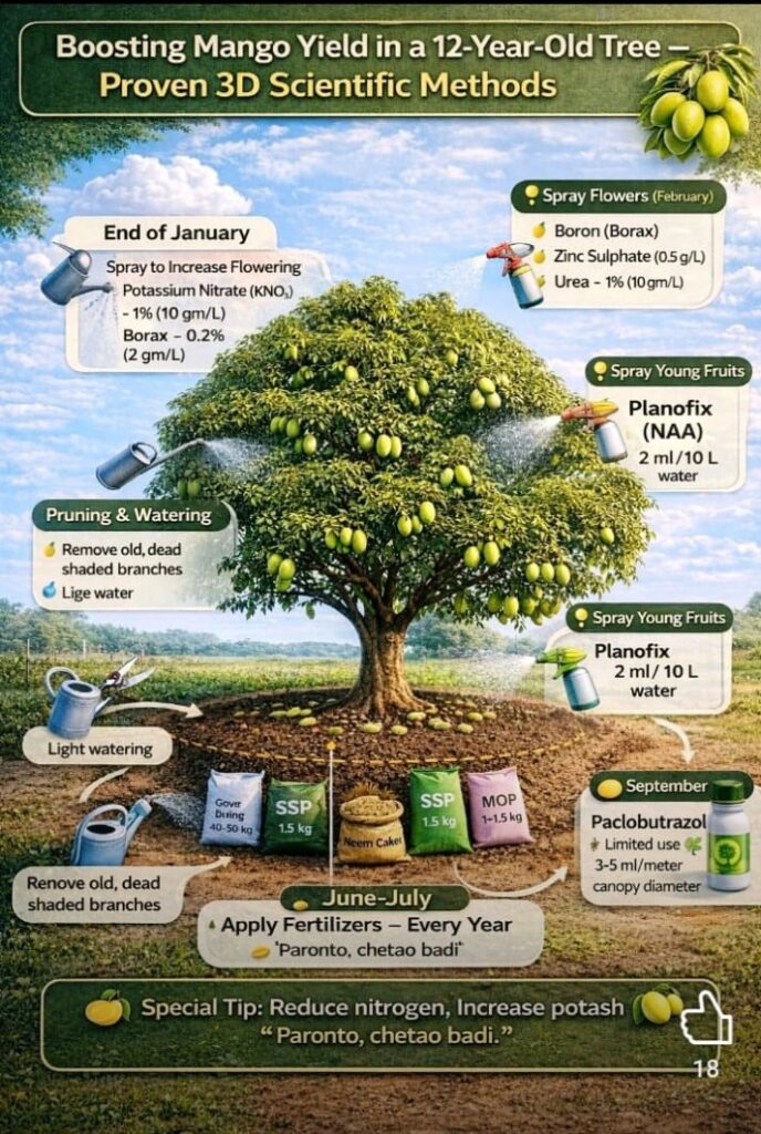 Mango yield in older trees can be improved through scientific nutrient management, pruning, and timely spraying.Nutrient and Spray Management